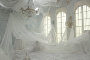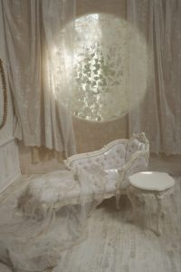 真白なB区画に家具を移動、白い布で覆い隠す事によりより立体的な”白”の演出をお楽しみいただけます。